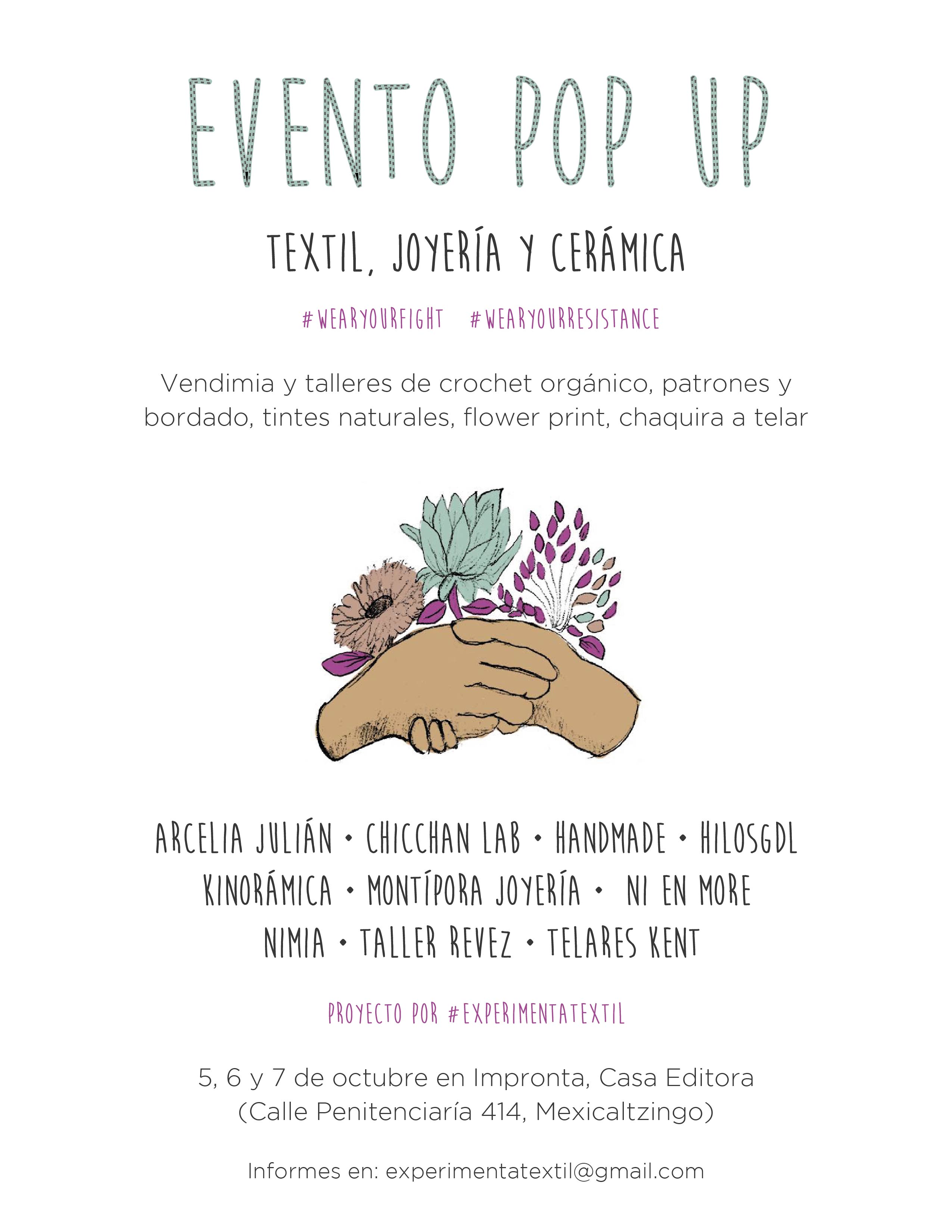 El evento Pop Up de textil, joyería y cerámica surge para apoyar el proyecto NI EN MORE (www.nienmore.com) un proyecto de innovación social sin fines de lucro creado por las artistas y promotoras Jane Terrazas y Lise Bjorne, el cual busca empoderar a las mujeres en Ciudad Juárez y protestar en contra de la violencia hacia la mujer en el contexto global, ofreciendo herramientas para su autonomía e independencia a través del oficio textil. Sumándose a esta causa, #ExperimentaTextil —una iniciativa independiente de promoción del arte textil— invita a un grupo de mujeres cercanas al medio textil a llevar a cabo talleres y vendimia para promover productos locales. Los proyectos participantes son: Arcelia Julian, Chicchan Lab, Handmade, Kino, Montípora, NI EN MORE, NIMIA, Taller Revéz y ESTAMBRES Y TELARES KENT. Además se contará con la intervención de #HilosGDL. El evento se llevará a cabo del 5 al 7 de octubre de 2018 (viernes y sábado de 10am a 6 pm y domingo de 10am a 3pm) y será hospedado por Impronta Casa Editora (Calle Penitenciaria #414, Col. Mexicaltzingo). El Pop Up contempla una oferta diversa de talleres, entre ellos: un workshop de flower print, un taller de tintes naturales, de crochet orgánico, de chaquira tejida a telar y de bordado de patrones, además de una participación colectiva para el bordado de resistencia. Para registro y más información, puedes escribir a experimenta.textil@gmail.com y seguir de cerca las novedades en el evento oficial de Facebook. #WearYourFight #WearYourResistance